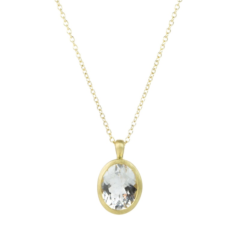 Reflect on lifes beauty in the sparkle of this 18k yellow gold necklace from Marian Maurer. An 8mm x 10mm oval shaped, 2ct goshenite is bezel set in a rounded brushed gold pendant. Pendant measures 3/8 x 5/8, including bail. Cable chain length with lobster