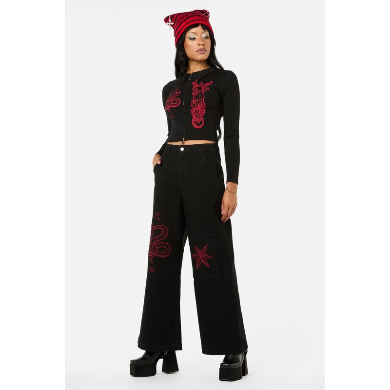 Gothic Style Fitted Cardigan- Long Sleeves- 2-Way Zipper On Front- Collar At Neckline- 'Grace' Embroiddered Artwork On Front And Sleeves- Made From Viscose/Nylon/Polyester Knit- Available In BlackProduct Code: BGFZ118