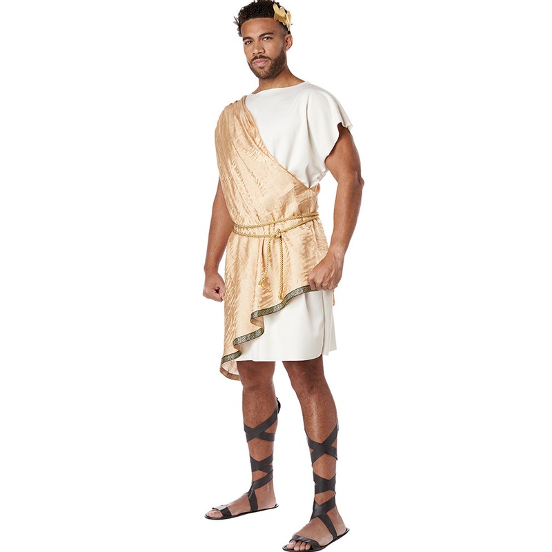 Item Includes:Tunic.Shoulder drape.Belt.Headband.Fit and Sizing:See size chart image for details.Fabrics and Care:Polyester.Hand wash, hang dry.Please note: Shoes not included.A ruler in goldTransform yourself into a greek statue in this Greek God Toga Men