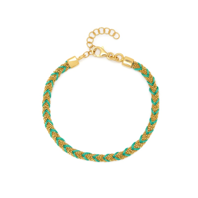 The Green and Gold Kuna Friendship Braceletis inspired by the woven fabrics in Central America, and is hand woven on an Italian loom using a unique Florentine technique. It is braided from natural green silk thread and 18ct gold plated sterling silver chai
