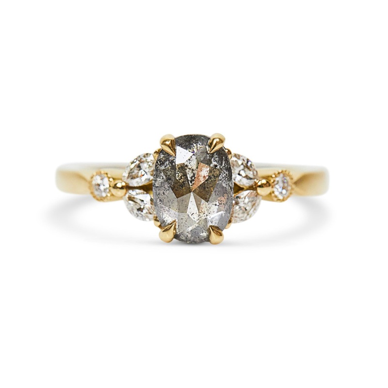 TheGrey Oval Diamond Ringis a one-of-a-kind ring. It features a rose-cut grey diamond, surrounded with a mix of four marquise and two round white diamonds. This ring is a low setting for active wearers.This stunning ring has been handcrafted in Sophia Pere