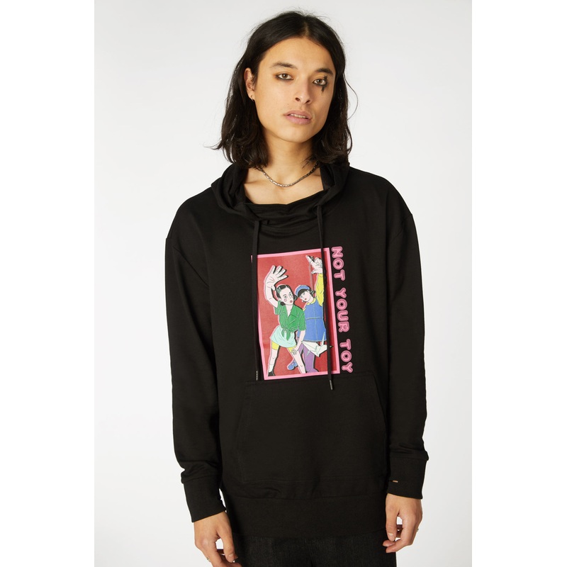– Relaxed fit hoodie – Long sleeves – Hood with draw strings – Kangaroo pocket at front – Front placement print – Available in Black