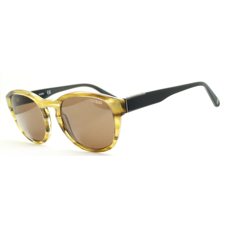 GUESS Full Rim Sunglasses -100% Authentic - GU 6856 45E Gloss transparent striped brown acetate frames Gloss black acetate arms with Guess logos on gunmetal top inserts Brown tinted lenses Brand new Lens Width = 52mm Frame Height = 50mm Bridge = 21mm Templ