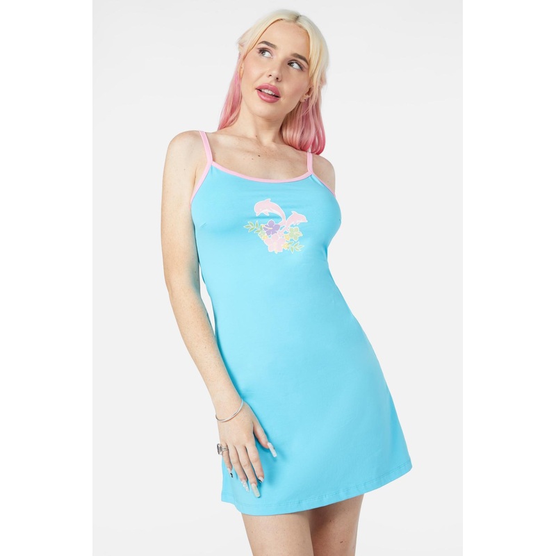 Y2K Style Fitted Dress- Adjustable Spaghetti Straps- Fitted Shape- 'H20' Artwork Placement On Front Chest- Contrast Colour Binding At Neckline, Armholes And Straps- Made From Stretchy Cotton/Elastane Jersey- Available In BlueProduct Code: DGFY409