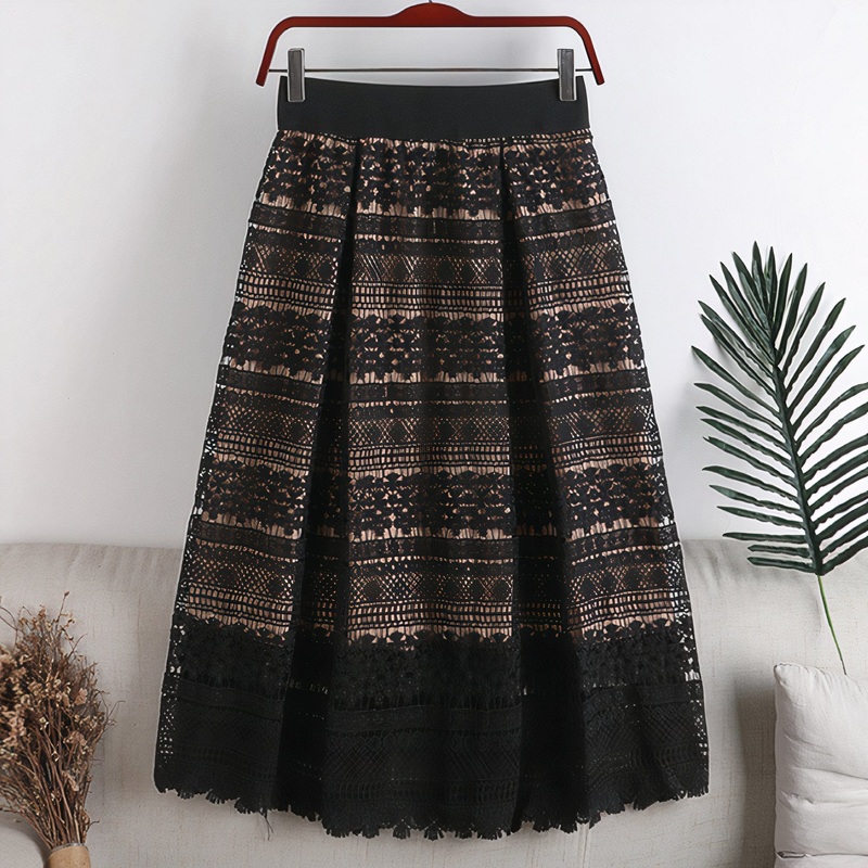 Our Halle Skirt is a twist to the classic lace skirt. With a vintage floral embroidery over a tan-colored lining, this A-line skirt will steal all the looks and even have some wanting to touch it. Calf-length and elastic waist that fits a Small, Medium and