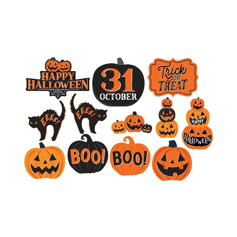 Item Includes:12 x Cutouts.Sizing:Cutouts vary in size.Material:100% Cardstock.Halloween fun!Decorate your home this Halloween with these family friendly Halloween Classic Orange and Black Cutouts Pack of 12. The cutouts come in a variety of designs like p