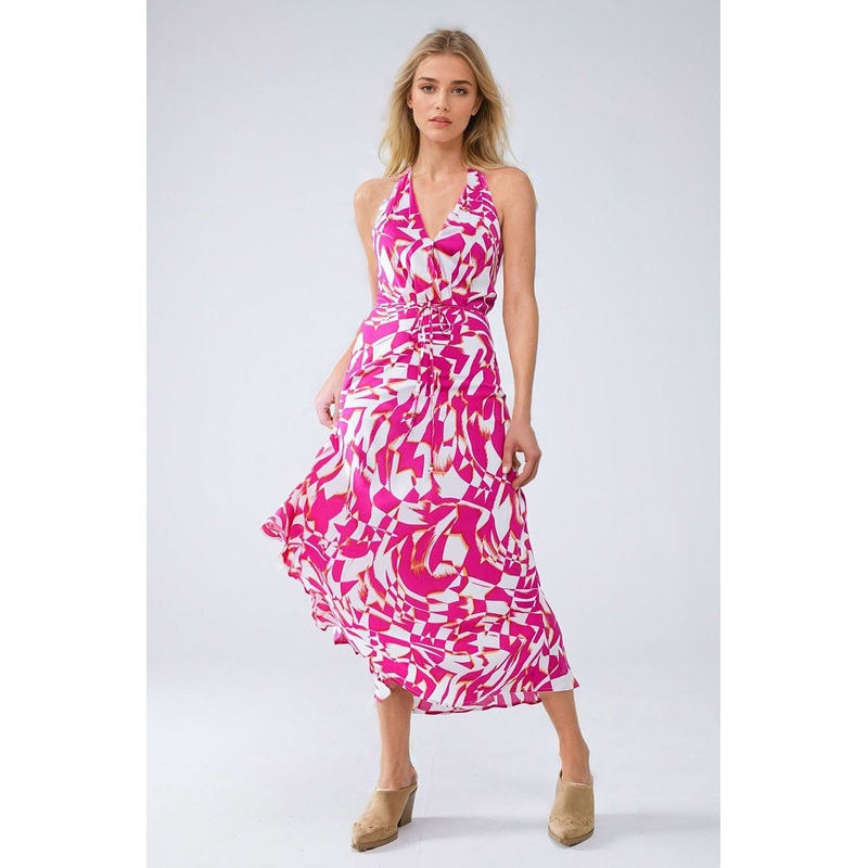 Halter Midi Dress With Cinched Waist In Abstract Fuchsia And White Print