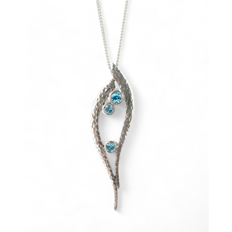 The Hammered Blue Topaz Pendantis handmade in sterling silver and features a hammered finish to create a unique texture.Blue Topaz: The focal point of the pendant is a vibrant Blue Topaz, catching the light with its vivid hue.Artisanal Hammering: The silve