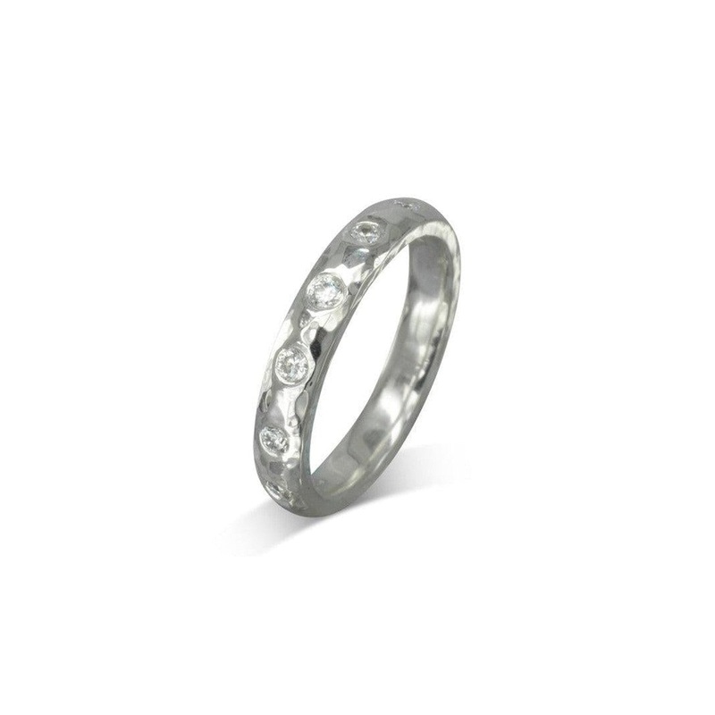 The Hammered Diamond Eternity Ring blends sparkling diamonds with the rustic charm of textured metal.HandmadeExcellence: Each eternity ring is lovingly handmade in either platinum or 18ct gold and is 3.5mm wide.Rustic Appeal: The rough-hammered texture of