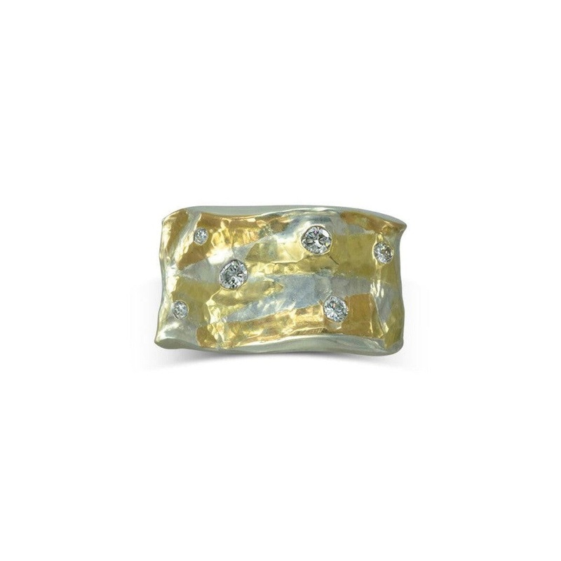 The Hammered Mixed Metal Diamond Ring (Wide) makes a versatile gift for any occasion whether you're celebrating a special anniversary or simply want to show your love and appreciation.Mixed Metal Brilliance:The ring is made from a silver base, with 18ct go