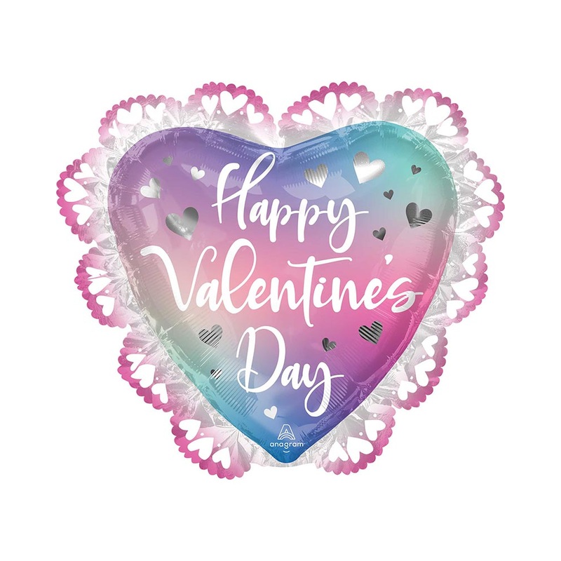 Experience the beauty of love with our Happy Valentines Day Filtered Ombre Intricates 58cm SuperShape Foil Balloon This heart-shaped balloon, featuring a captivating pastel ombre colour palette, exudes romance with its delicate lace-style border. The filtered ombre effect adds an artistic touch, creating a mesmerising visual that complements the heartfelt ‘Happy Valentine’s Day’ message. Combine with our range of Valentine’s Day balloons to mix and match and create the perfect scene for your party.
