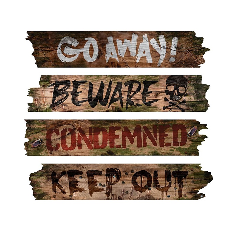 Be sure to keep out prying eyes with these Haunted Window Boards with Words Pack of 4. The boards come in a pack of four and easily stick across your windows with the included double-sided tape to look like you’ve nailed wooden panels across them. The boards feature four different words of warning including: “Go Away!”, “Beware”, “Condemned” and “Keep Out”. Perfect for adding that extra bit of flair to your Halloween Haunted house decorations this year, just combine with more of our fantastic range of zombie plague or haunted house party supplies to complete your decor designs.