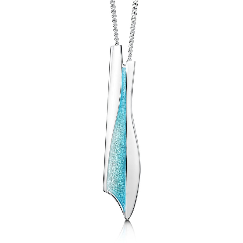 This Headlands dress necklace in sterling silver features a long abstract design that mimics the headlands around Orkney. The piece is hand-enamelled in our workshop in Orkney and hangs delicately from a silver curb chain.A collection inspired by the drama