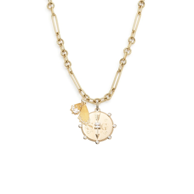 DescriptionHandcrafted in 18-karat Yellow Gold, this Small Mixed Clip Necklace symbolizes Reverie and Heart at Peace. This necklace is sold with our Heart at Peace Engravable Medallion at the base and paired with our Encrusted Butterfly Wings. A single arr