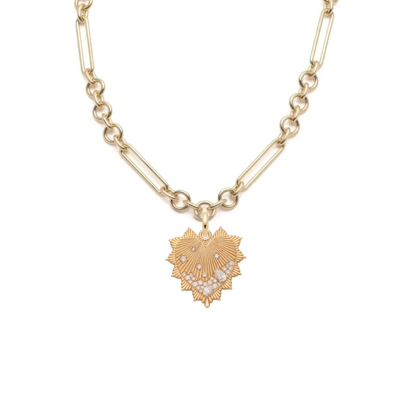 Handcrafted in 18k yellow gold, our Heart Love Token Midsize Mixed Clip Necklace Story features alternating series of round and elongated links. The Heart Love Token Medium Medallion with artfully scattered diamonds celebrates seven types of love as defined thousands of years ago by the ancient Greeks: Eros (romantic love), Philia (friendship), Agape (universal love), Storge (love between parent and child), Ludus (playful love), Pragma (love founded on duty & reason), and Philautia (self-love). The medallion’s Oval Annex Link allows you to effortlessly clip it on and off the necklace for styling versatility.