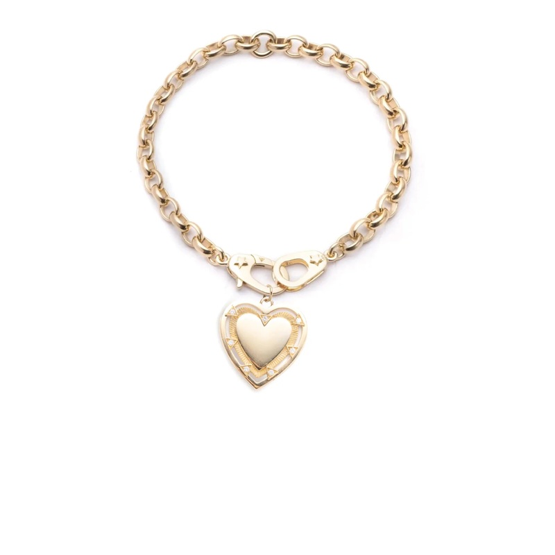 The bracelet is composed of our heavy belcher chain and anchored to the chain are sister hooks that fit perfectly intertwined with each other. The medallion can be worn as a bold high shine heart or engraved with a reminder that fills your heart. True Love binds the heart forever… A choice of 1 3 letters or a date with Cypher, Maximalist, or Script. The Medallion has 7 Diamonds representing the 7 Types of Love.