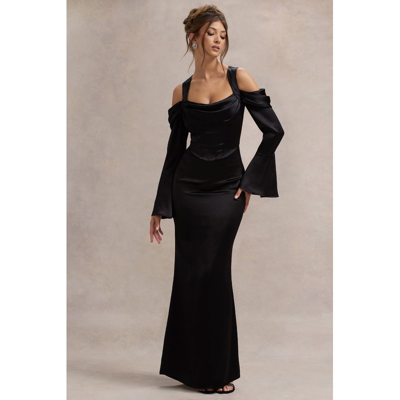 Heartthrob | Black Satin Draped Bardot Maxi Dress