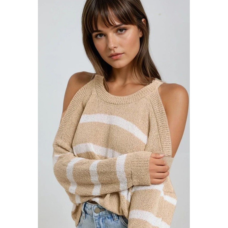 Add a fresh twist to your knitwear collection with the Heather Sweater, a chic and lightweight piece designed to blend comfort with modern style. Featuring an alluring open-shoulder detail, this sweater elevates the classic crewneck silhouette with a subtle hint of sophistication. The beige and white horizontal stripes lend a clean, contemporary vibe, perfect for refreshing your look in any season.