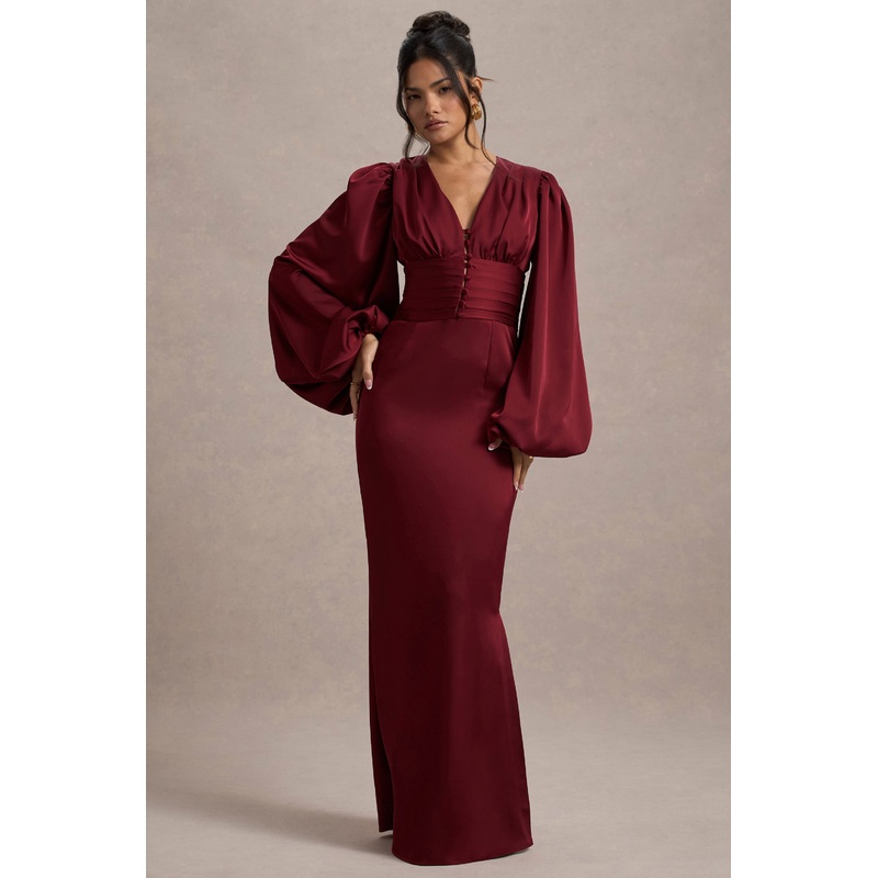 Helsinki | Berry Satin V-Neck Balloon Sleeve Maxi Dress