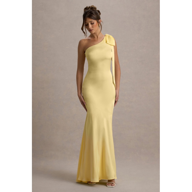 Here For Love | Pale Lemon Satin Asymmetric Maxi Dress With Bow