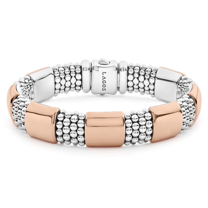 Seven smooth stations of 18K rose gold surrounded by sterling silver Caviar beading form this bracelet.
