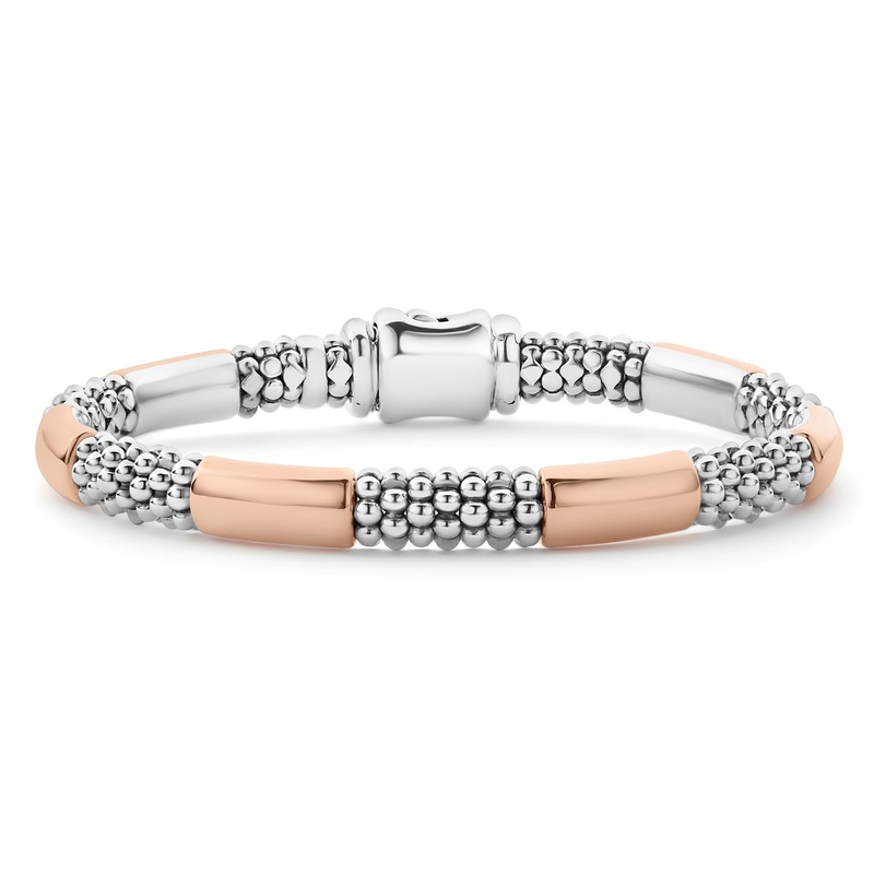 Six smooth stations of 18K rose gold surrounded by sterling silver Caviar beading form this bracelet.