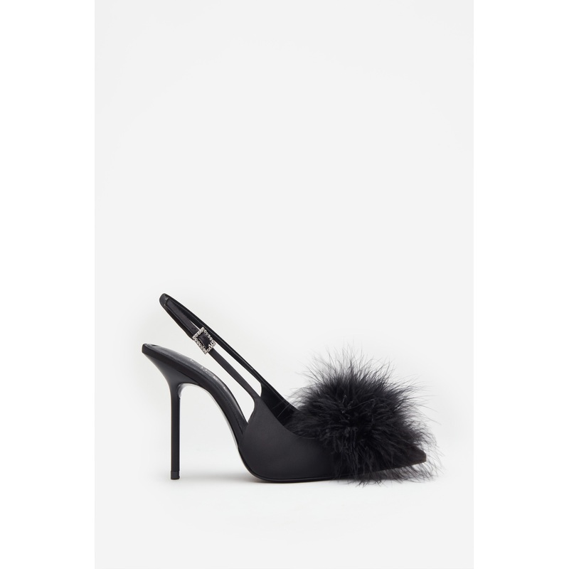 Add a playful touch to your evening wardrobe this season with our High Pitched pumps. Defined by a statement feather pom pom, these black stilettos feature a diamant buckle, pointed-toe and adjustable sling-back detail. With incredibly soft padded soles, H