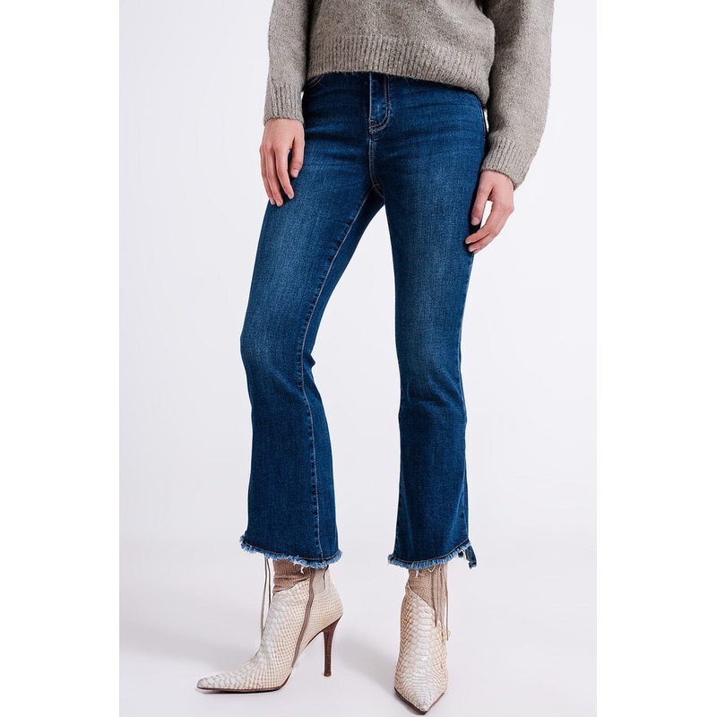 Flared stretchy ankle-length jeans with an asymmetrical raw hem, with contrast-colored seams, and 5 pockets with a zip and button closure. The fabric is made from 92% Cotton, 6% Polyester, and 2% Elastane. In our photos, we show the jeans with our Khaki Ba