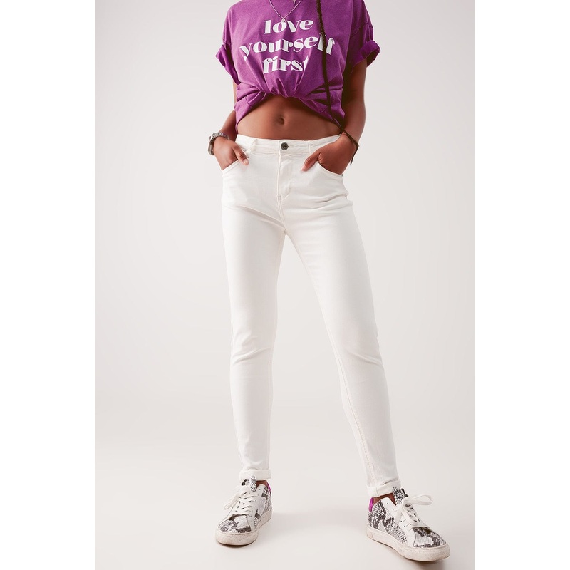 In a neutral cream hue, these are high-waisted skinny jeans that are very elastic and stretchy. They boast of utility pockets on the sides and in the back as well as utility belt loops, which give you the option of adding a belt if you wish, and a zip fly
