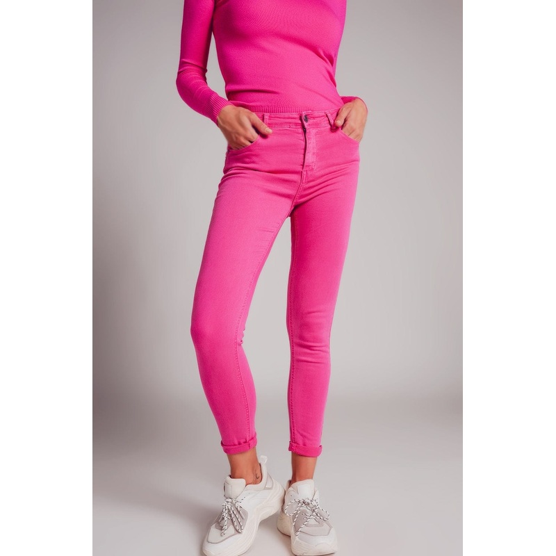 In a beautiful and trendy fuchsia hue, these are high-waisted skinny jeans that are very elastic and stretchy. They boast of utility pockets on the sides and in the back as well as utility belt loops, which give you the option of adding a belt if you wish,