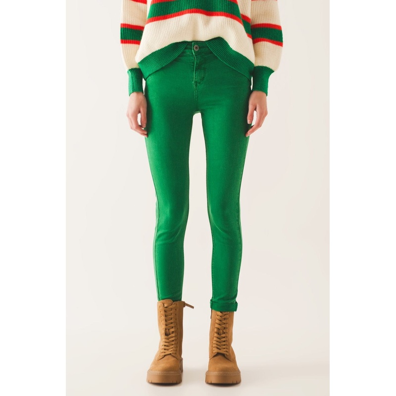In an eye-catching green hue, these are high-waisted skinny jeans that are very elastic and stretchy. They boast of utility pockets on the sides and in the back as well as utility belt loops, which give you the option of adding a belt if you wish, and a zi