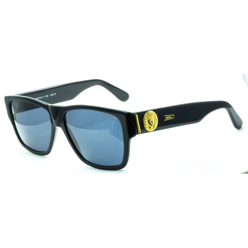 HILTON EYEWEAR Full Rim Vintage Sunglasses 100% Authentic - Picadilly 953 col 01 Gloss black acetate frames and arms with large g old logos Grey tinted lenses, one with Hilton logo Never been worn - Brand new, old stock from the 1980's Lens Width = 55mm Fr