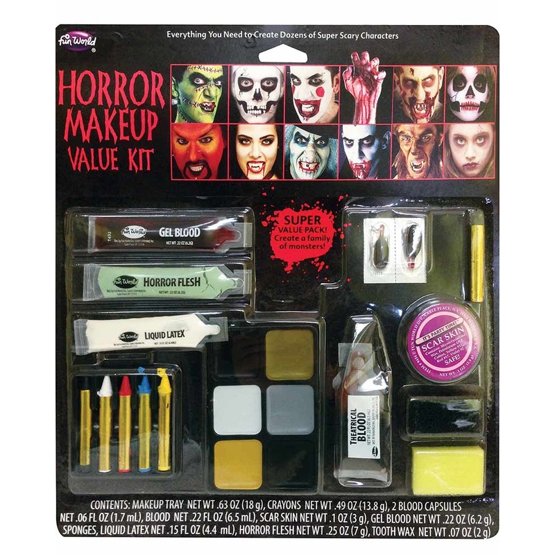 Ingredients: MAKEUP COLOR TRAY – Mineral Oil (Paraffinum Liquidum), Polysorbate 60, PPG-2 Myristyl Ether Propionate, PEG-40 Sorbitan Diiostearate, Propylparaben, Talc, C18-36 Acid Triglyceride, Tribehenin, Titanium Dioxide (CI 77891), Ultramarines (CI 77007), Iron Oxides (CI 77492, CI 77499), Red 7 (CI 15850) Yellow 5 (CI 19140). MAKEUP CRAYONS – Mineral Oil (Paraffinum Liquidum), Lanolin, Ozokerite Wax, Microcrystalline Wax, Polysorbate 60, Acetamide MEA, Propylparaben, Talc, Iron Oxides (CI 77499), Titanium Dioxide (CI 77891), Ultramarines (CI 77007), Yellow 5 (CI 19140), Red 7 (CI 15850). LIQUID LATEX: Rubber Latex, Water (Aqua), Ammonium Hydroxide, Ammonium Laurate, Potassium neodecanoate, Benzisothiazolinone. LIQUID BLOOD: Water (Aqua), Imidazoidinyl Urea, Red 40 (CI 16035), Blue 1 (CI 42090), Triethanolamine, Hydroxyethylcellulose, Propylene Glycol, Methylparaben. GEL BLOOD: Water (Aqua), Gelatin, Propylene Glycol, Glycerin, Methylparaben, Phenoxyethanol, Disodium EDTA, Red 40 (CI 16035), Blue 1 (CI 42090). HORROR FLESH: Bentonite, Kaolin, Propylene Glycol, Methylparaben, Propylparaben, Imidazolidinyl Urea, Water, Titanium Dioxide (CI 77891), Chromium Oxide Greens (CI 77288). BLOOD CAPSULES: PEG 8, Gelatin, Glycerin, USP, Sorbitol Special, Water (Aqua), PVP, Sodium Saccharin, Strawberry Flavour, Red 40 (CI 16035), Blue 1 (CI 42090). TOOTH WAX: Cera Microcrystalline (microcrystalline wax), Paraffin, Cera Alba (Beeswax), Iron Oxides (CI 77499). SCAR SKIN: Cera Microcrystalline (microcrystalline wax), Petrolatum, Red 17 (CI 26100), Violet 2 (CI 60725), Yellow 11 (CI 47000).