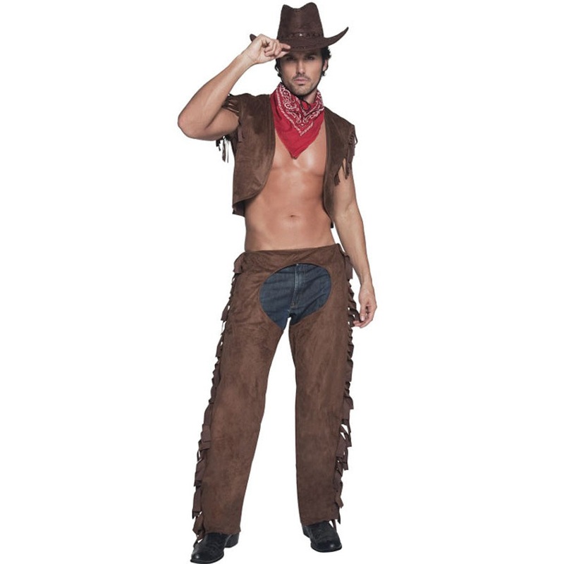 Then this is the costume for you!Hot Cowboy Mens Costume featuring NO SHIRT, a fringed vest, matching faux suede chaps and a bandana to keep your neck warm. You may want to get a spray tan.Item Includes: Vest.Chaps.Bandana.Fit and Sizing:See size chart abo