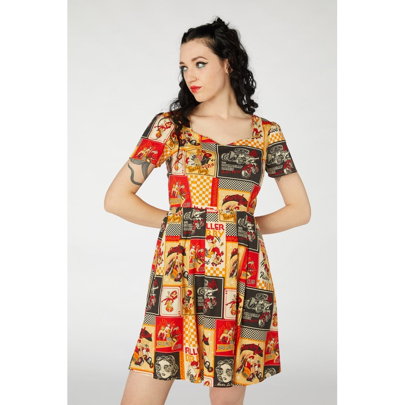 Printed dress with short sleeves and sweetheart neckline detail - Cotton Elastane fabric - Center back zipper - Short sleeves - Sweetheart neckline - Bodice is lined - Inseam pockets - Fit and flare silhouette - Above knee length - Exclusive Revival print