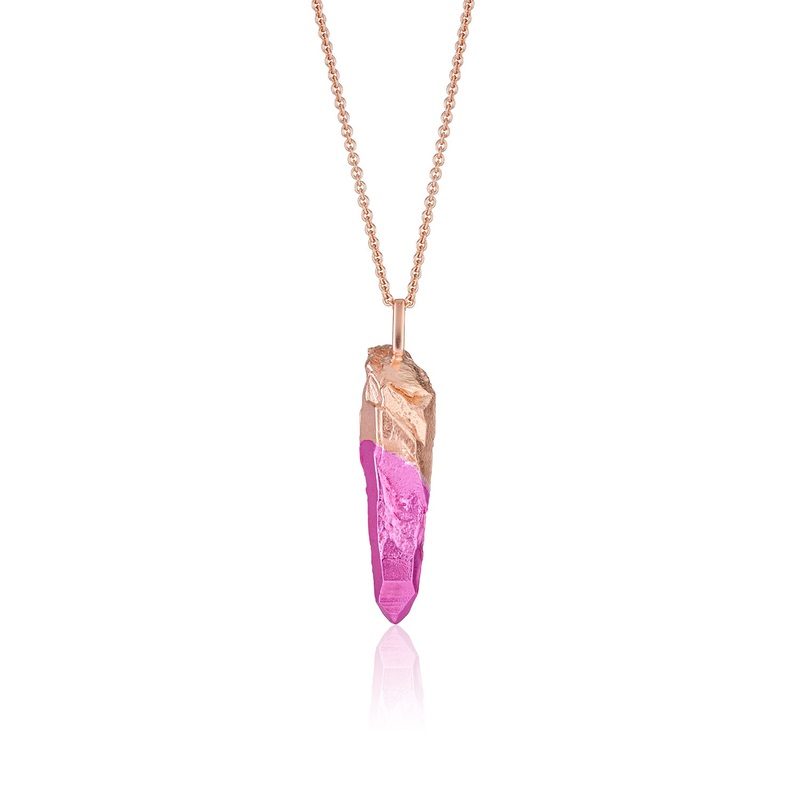 TheHotRocks Alchemy Wand Necklace - Roseis made in the UK from18ct rose Fairmined goldvermeil on AgAIN recycled 925 sterling silver (salvaged from NHS X-Rays). It features arose pink ceramic-coated tipped pendant, taking the form of a quartz wand, which is