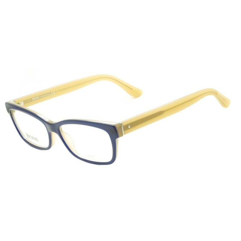 HUGO BOSS Full Rim Frames - 100% Authentic - 0745 KIQGloss blue over nude acetate framesGloss transparent nude acetate arms inlaid with Hugo Boss logosNever been wornLens Width = 53mmFrame Height = 37.5mmBridge = 15mmTemple (Arm Length) = 140mmSUPPLIED WIT