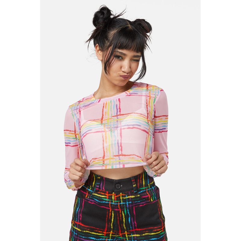 Printed Mesh-Features Rainbow ‘Hype Queen’ Tartan Artwork-Crop Length-Round Neckline-Full Length Sleeves-Made From Polyester Elastane Blend-Available In Pink