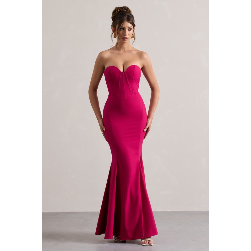 Idyllic | Hot Pink Strapless Corset Style Fishtail Maxi Dress