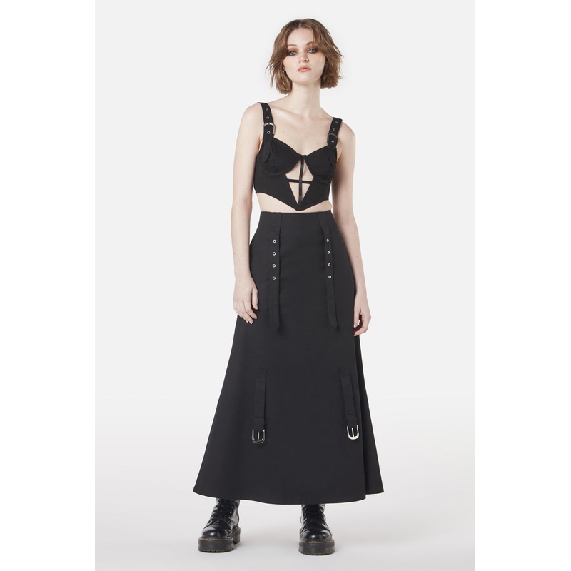 Strap Detail Skirt-Skirt Has Length Adjusting Straps-Can Be Worn As Long Skirt Or High Low -Fitted Waist-Made From Cotton Drill-Available In BlackProduct Code: DGFW184