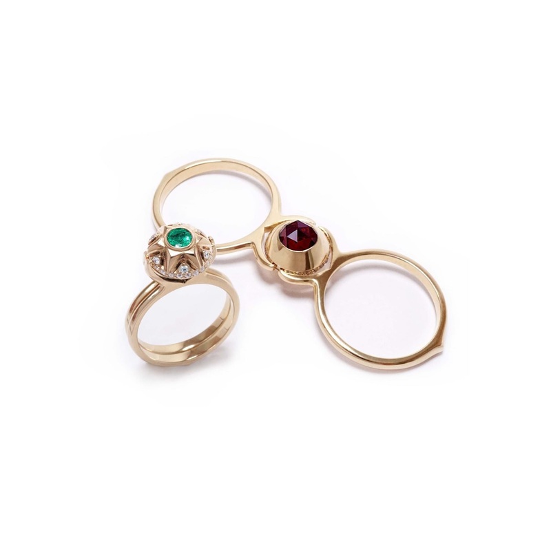 TheInfinity Love Ring Ornate is made from 18 carat yellow gold. It has two different sides, one more ornamental set with diamonds and a central stone of choice, the second side of the ring is more minimalistic- set with a bigger stone in a special high ros