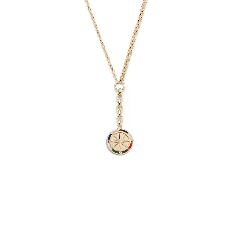Handcrafted in 18 karat yellow gold, this Medium Mixed Belcher Chain Necklace is paired with our Internal Compass Medium Ceramic Medallion featuring brightly colored enamel around the edges and a white diamond in the center of the compass.
