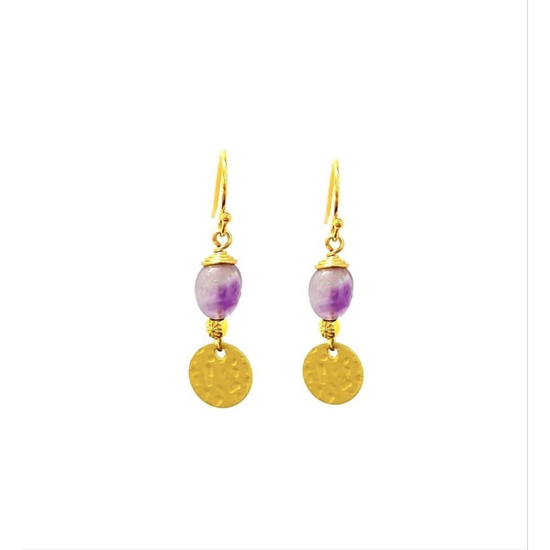 Gold earrings with amethyst. 1.5 inches long. Pierced. French wire.