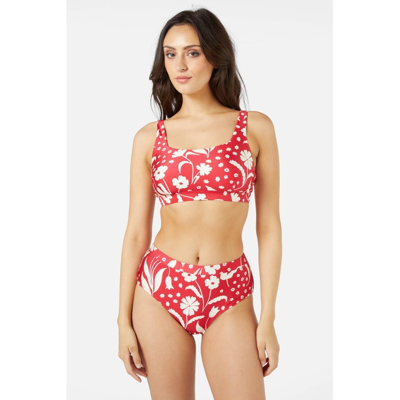 Two tone bold floral printed bikini top- square neck- fixed adjustable straps- removable cups- back rear clasp- nylon elastane blend swim fabric with lining- available in cherryProduct Code: PGFY343