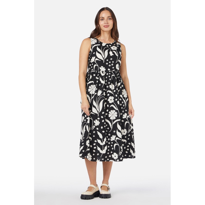 Two tone bold floral printed midi dress, sleeveless style with a relaxed bodice and gathered skirt- easy slip on style with back keyhole and button- sleeveless - relaxed fit bodice- gathered midi skirt- made of a linen viscose blend - available in black Pr