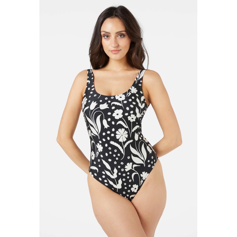 Two tone bold floral printed one piece swim suit – scoop neck – thick shoulder straps – scoop back – removable cups – full body coverage – nylon elastane blend swim fabric – available in black