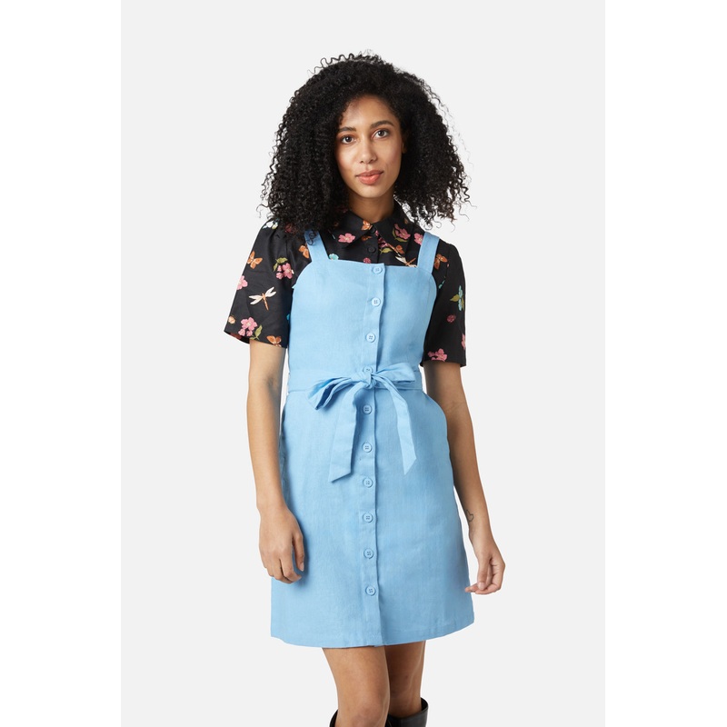 Button front pinny- wear this piece all summer long and add layers to take it into autumn- button down style- thick over shoulder straps- removable waist tie- made of a linen cotton blend fabric- available in black and blueProduct Code: PGFU508130