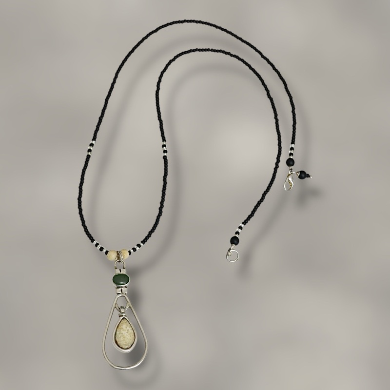 Fossil Walrus Ivory, Jade & .925 Sterling Silver ClaspPendant Size - 2 1/2" lengthNecklace Size - 18 1/2" lengthStainless Steel WireFossil Information card includedOne of a kind