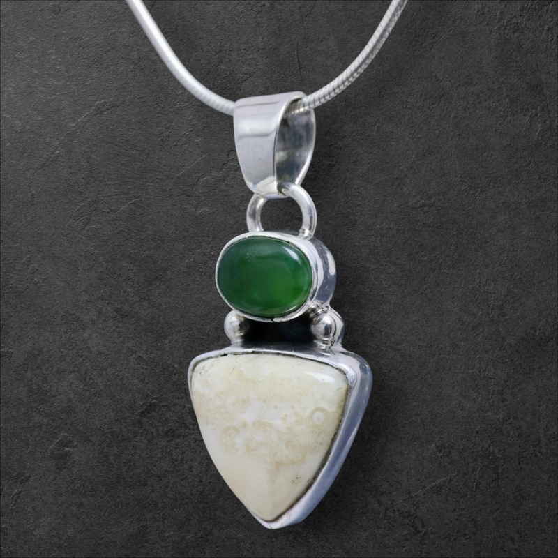 Fossil Walrus Ivory, Jade & .925 Sterling SilverSize - 1 3/8" length x 5/8" widthOne of a kindInformation card includedChains are available...Click Here!