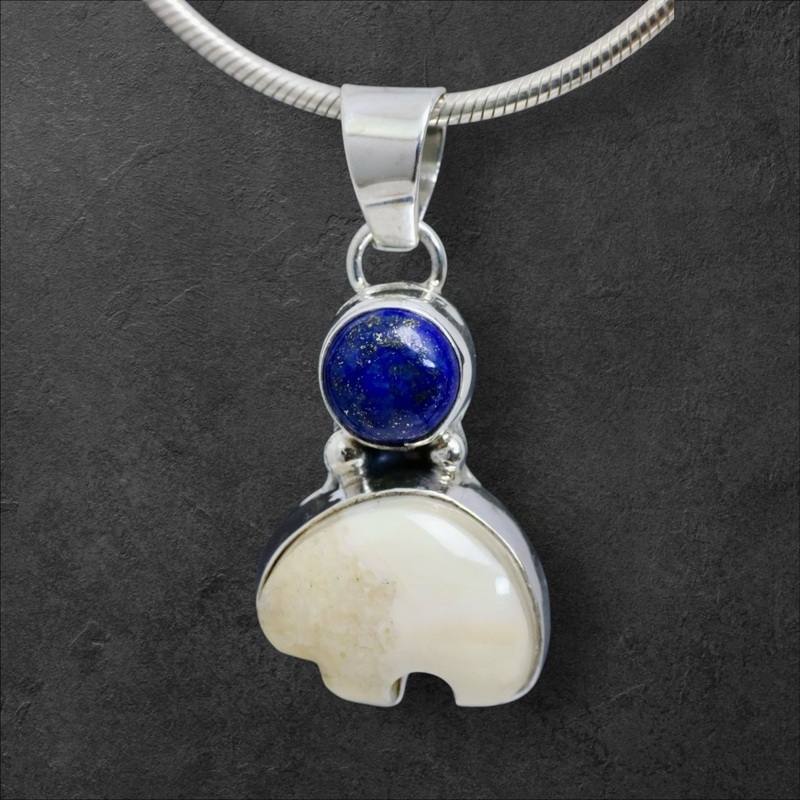 Fossil Walrus Ivory, Lapis & .925 Sterling SilverSize - 1 3/8" length x 1" widthIncludes Artist / Material CardChains are available! Click Here!
